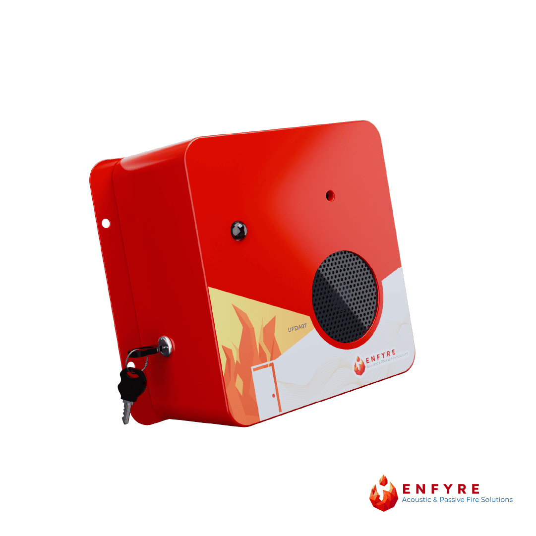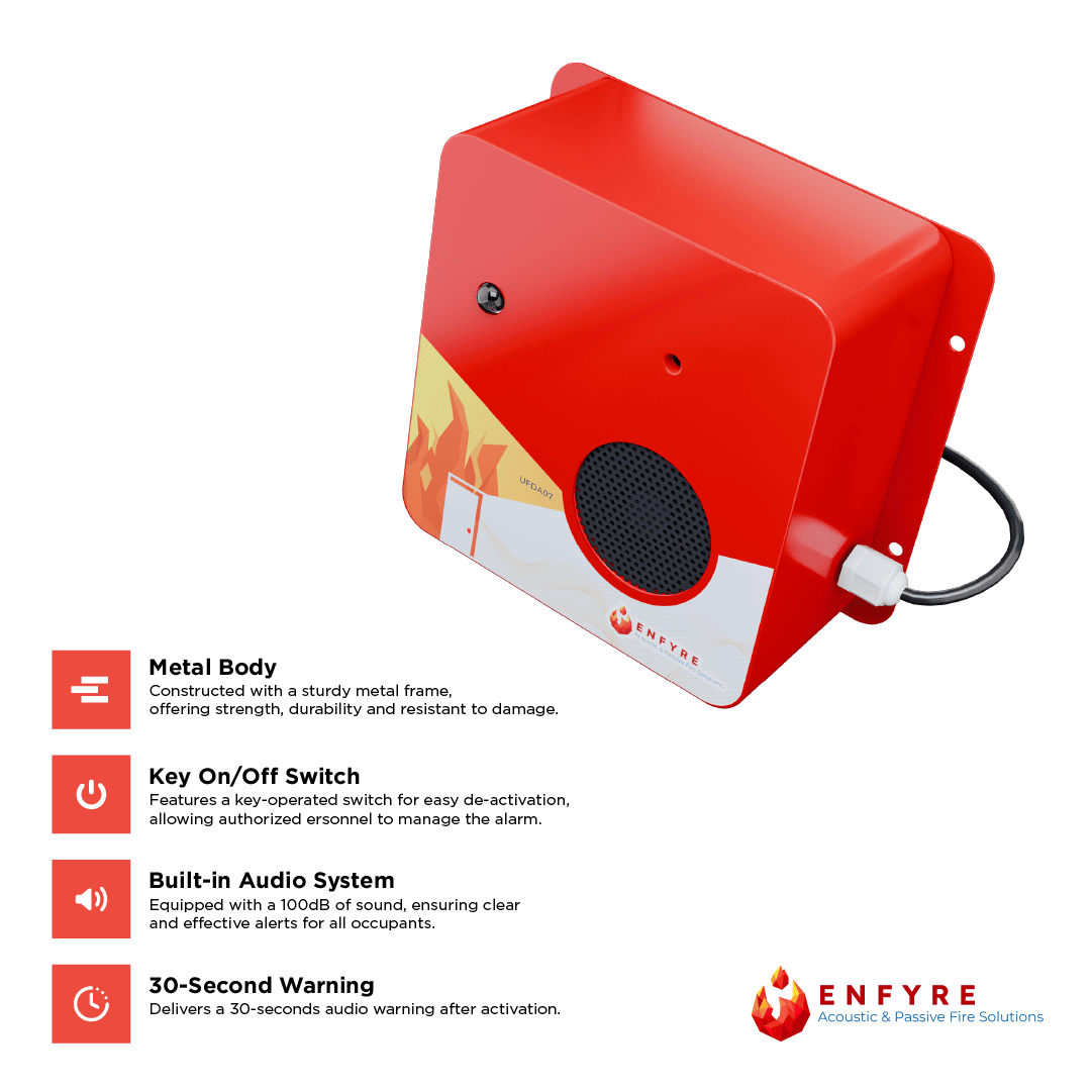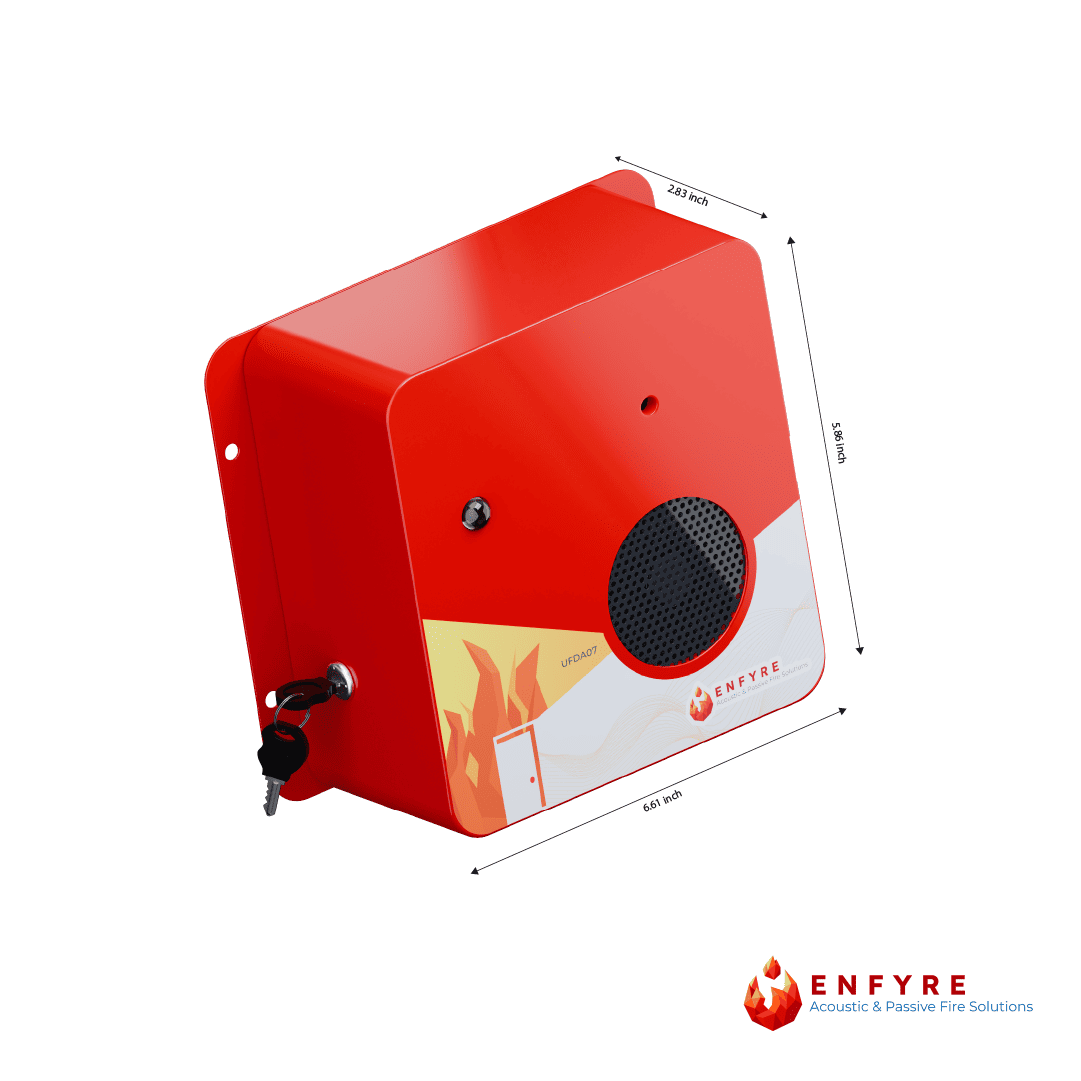Ensure safety and compliance with our Mains Powered Fire Exit Door Alarm, designed for commercial malls, residential buildings, and industrial settings. Equipped with a Door Monitoring Alarm that activates when a door remains open too long, this device offers a 110 dB high-intensity alarm, smart AI voice alerts, and an indication light for added visibility. Built with a heavy metal body and available in red, this alarm also features a sound enable/disable function for maintenance and comes with optional inbuilt power supply or battery operation.